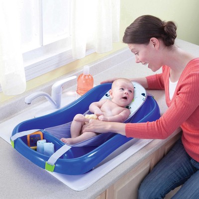 Introduce your baby to soothing baths with a secure sling that safely cradles their tiny body and supports their neck and head. The first years sure comfort deluxe newborn to toddler tub. It offers four stages to grow with your baby.