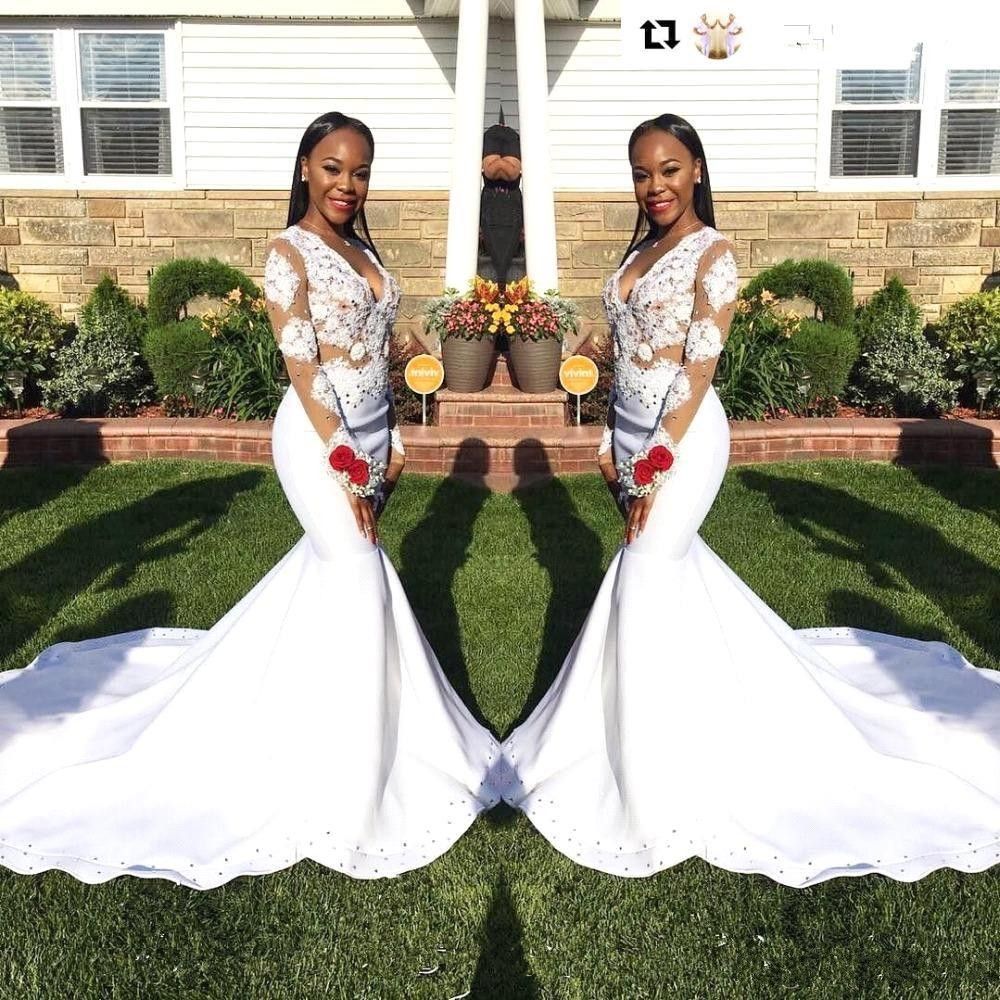 White Appliques Long Sleeves Simple Wedding Dresses Black Girl Sexy V Neck Sheer Stretch Satin Long Party Gowns Bridal Dresses
