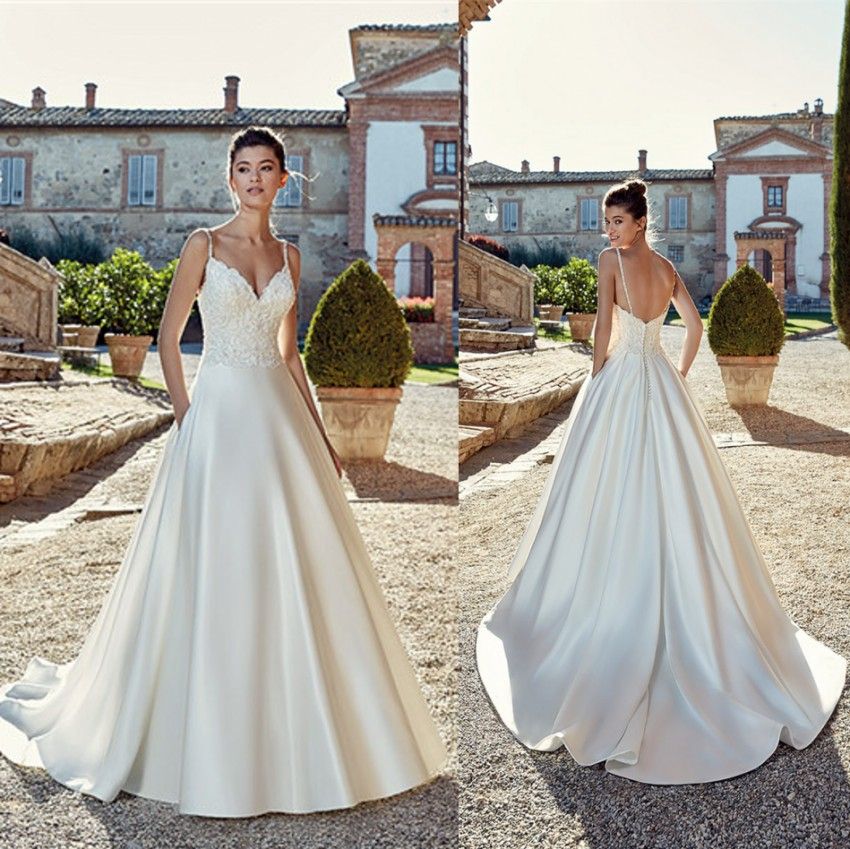 Discount Elegant A Line Wedding Dresses Spaghetti Straps Appliqued Satin Long Bridal Gowns Formal Sexy Backless With Buttons Covered Back Wedding