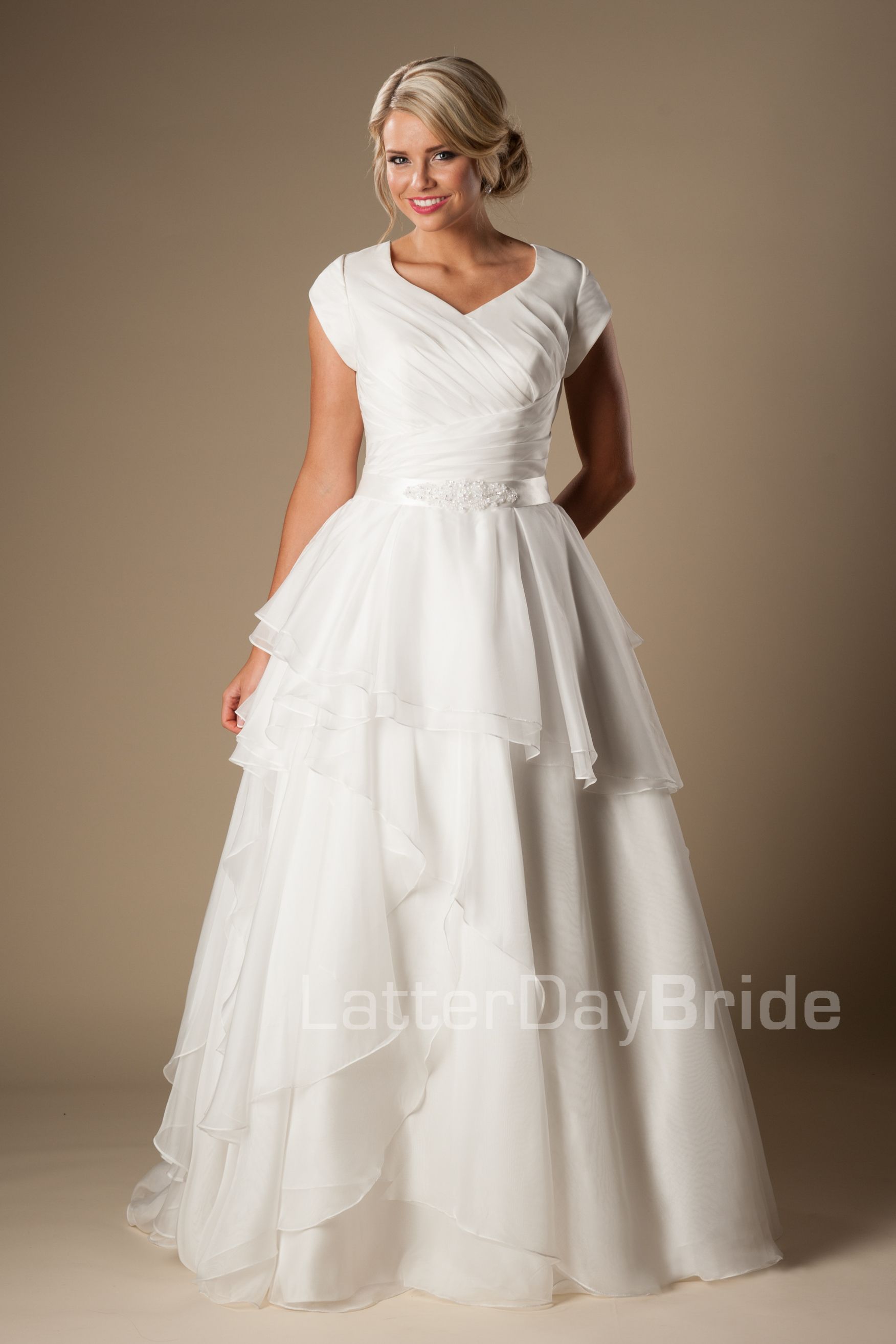Tiered Organza Skirt Modest Short Sleeves Princess Wedding Ball Gown
