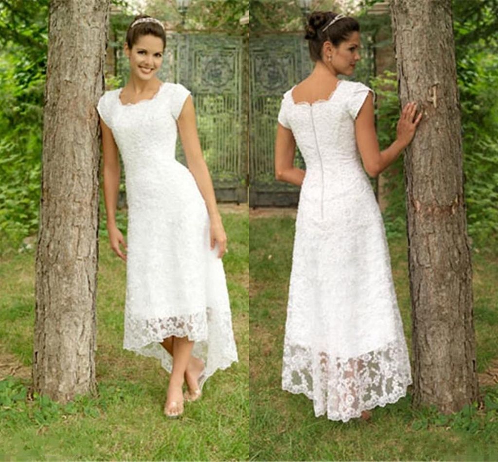 Full Lace Beach Wedding Dresses A Line Jewel Short Sleeves High Low Bridal Gowns Plus Size White Wedding Gowns Dh386