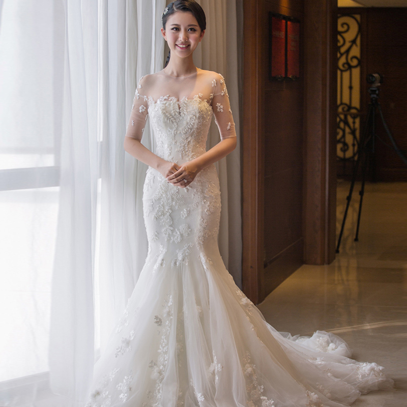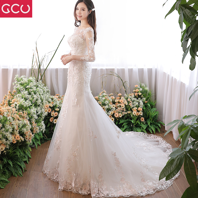 2018 New Thin Sleeve Bride Wedding Dress Slim Simple Fishtail Long Tail Fashion Sen White And Ivory