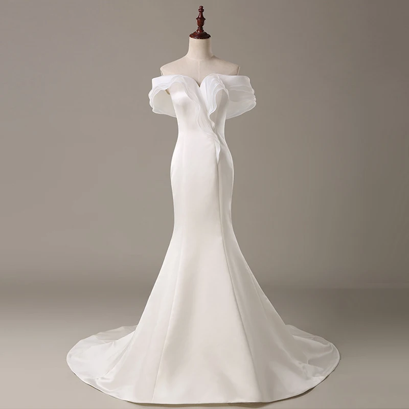 Annual Meeting Dress Bride Word Shoulder Wedding Dress Fishtail Simple Satin Tail Custom Host Dress Female New