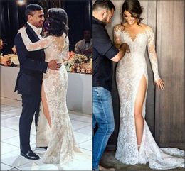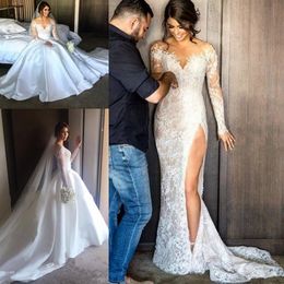 Discount 2017 New Split Lace Steven Khalil Wedding Dresses With Detachable Skirt Sheer Neck Long Sleeves Sheath High Slit Overskirts Bridal Gown 2016