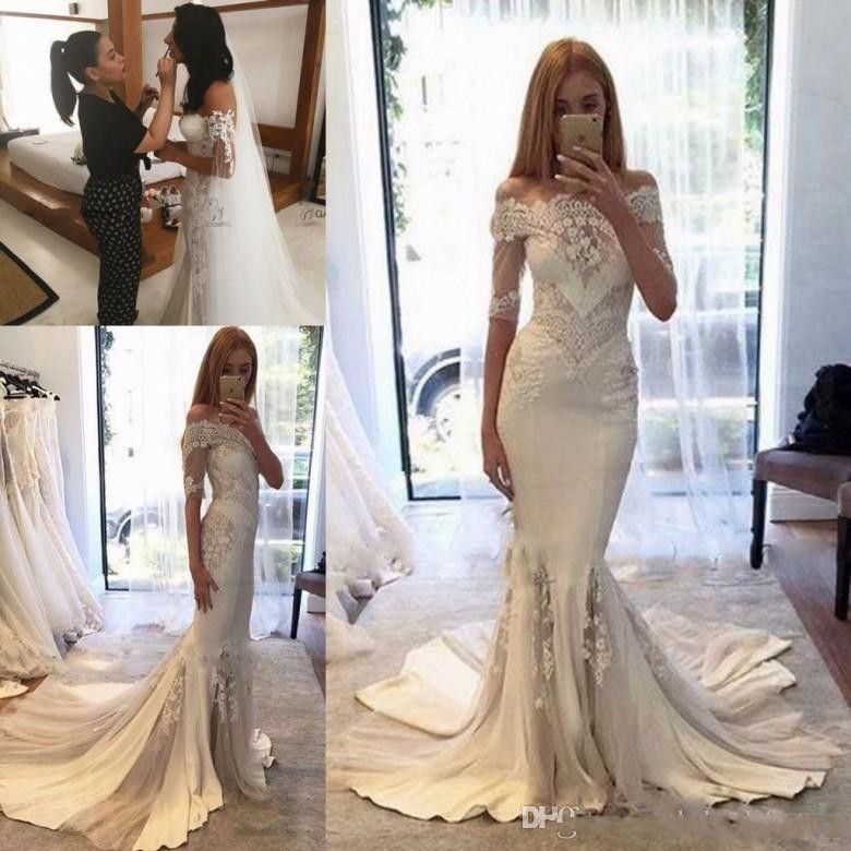 Tulle Lace Appliqued Beaded Off The Shoulder Mermaid Bride Dresses With Short Sleeves Steven Khalil Wedding Dress