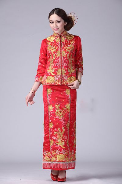 2013 Chinese Traditional Style Wedding Dress Toast Cheongsam Bride Wedding Cheongsam Heavy Handwork Embroider Dragon And Phoenix Cheongsam