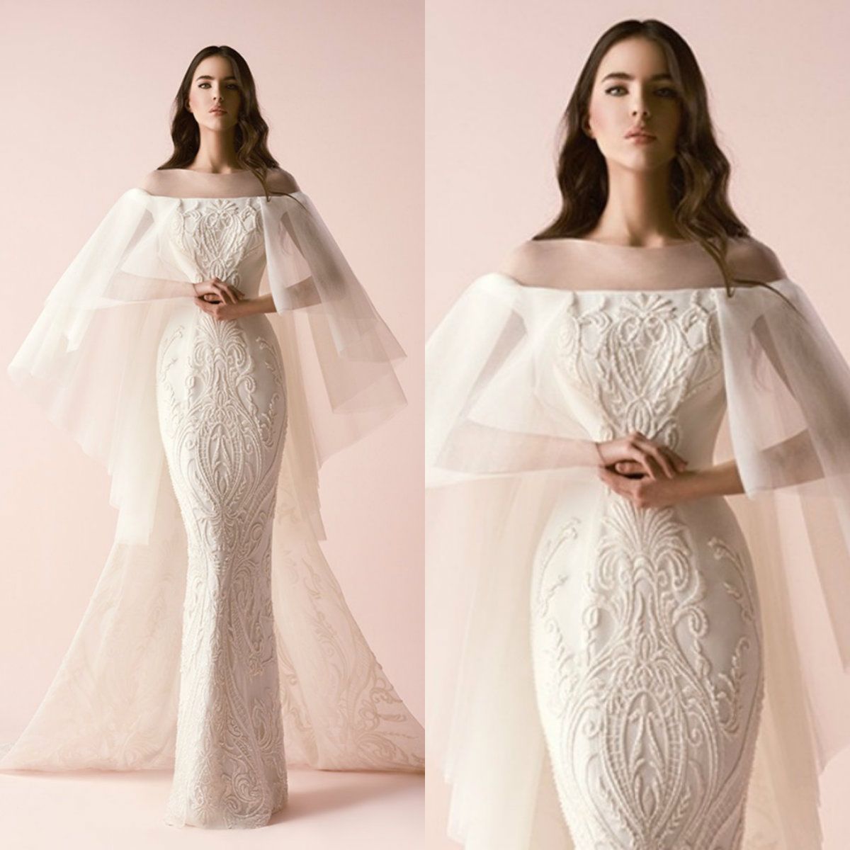 2019 Designer Mermaid Wedding Dresses Off Shoulder Appliques Women Slim Fit Bridal Gowns With Long Wrap Custom Made Wedding Dress Wedding Dresses For