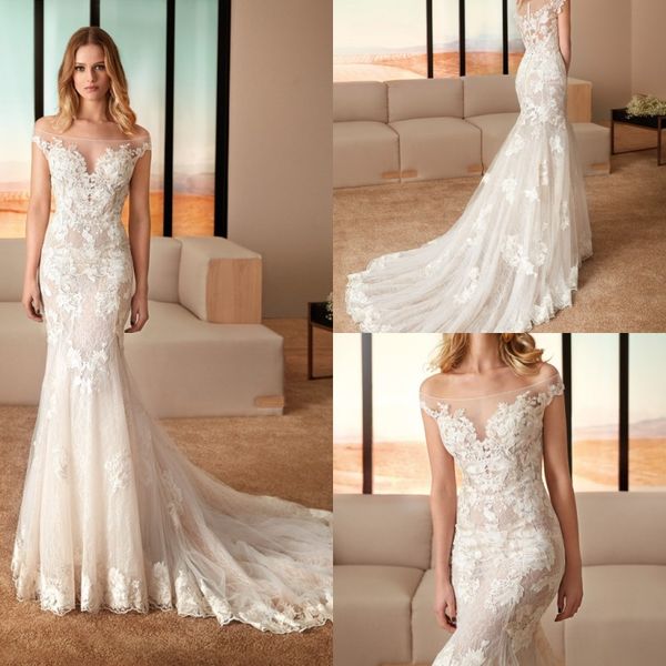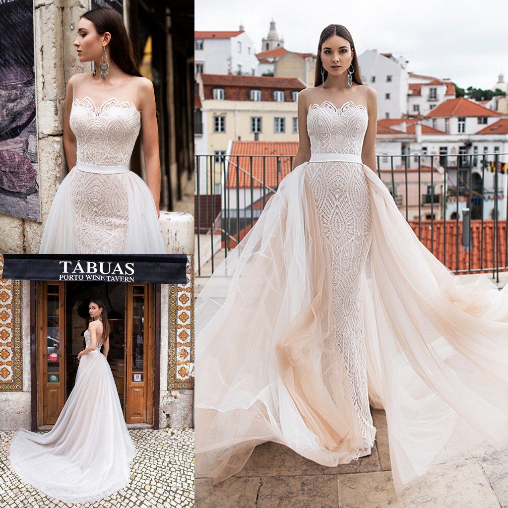 Elegant 2019 Mermaid Wedding Dresses With Detachable Train Sheer Neck Lace Bridal Gowns Slim Fit Boho Beach Wedding Dress Custom