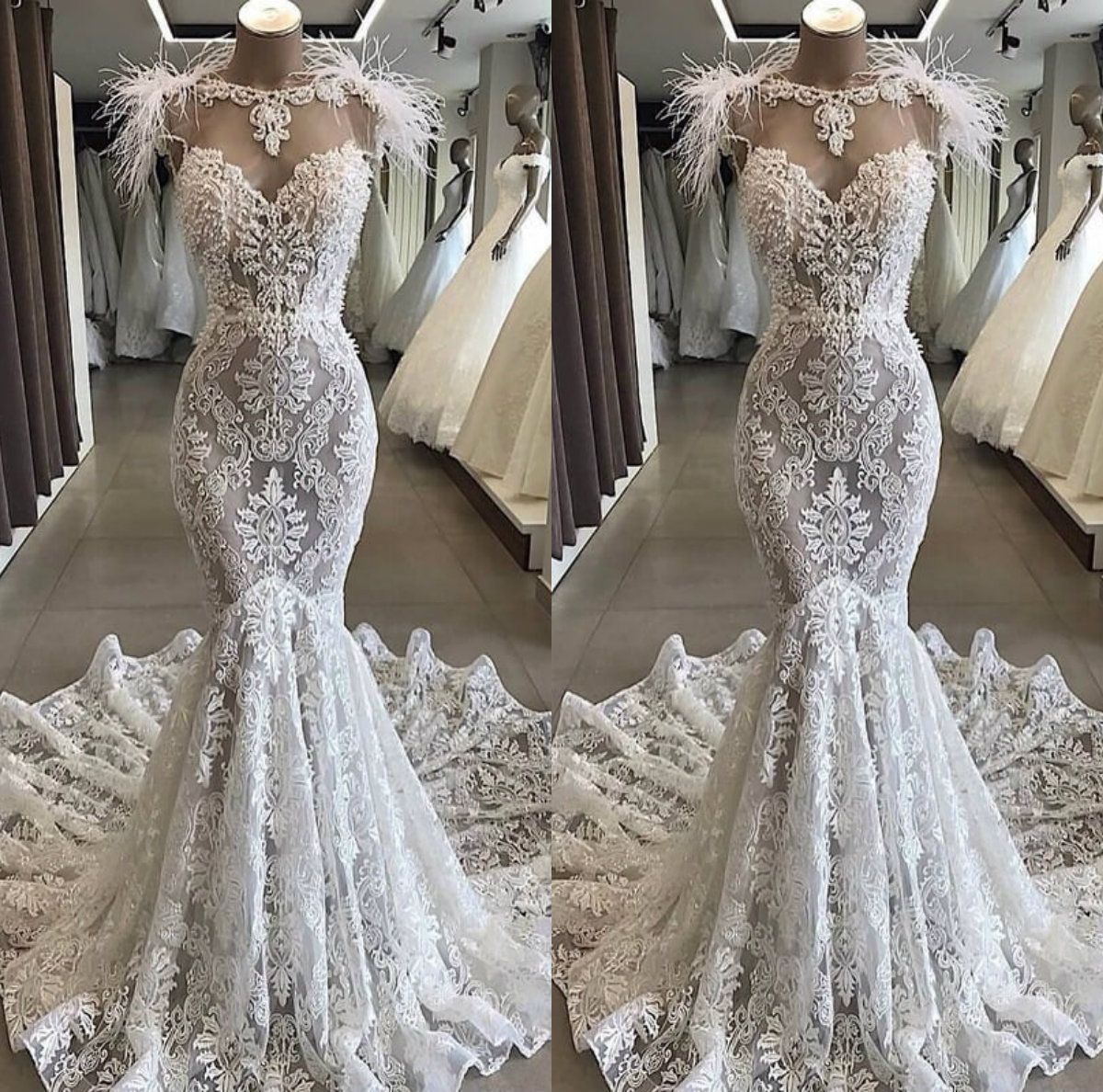 2019 Lace Wedding Dresses With Feather Slim Fit Appliqued Pearls Court Train Mermaid Wedding Dress Custom Made Plus Size Country Bridal Gown