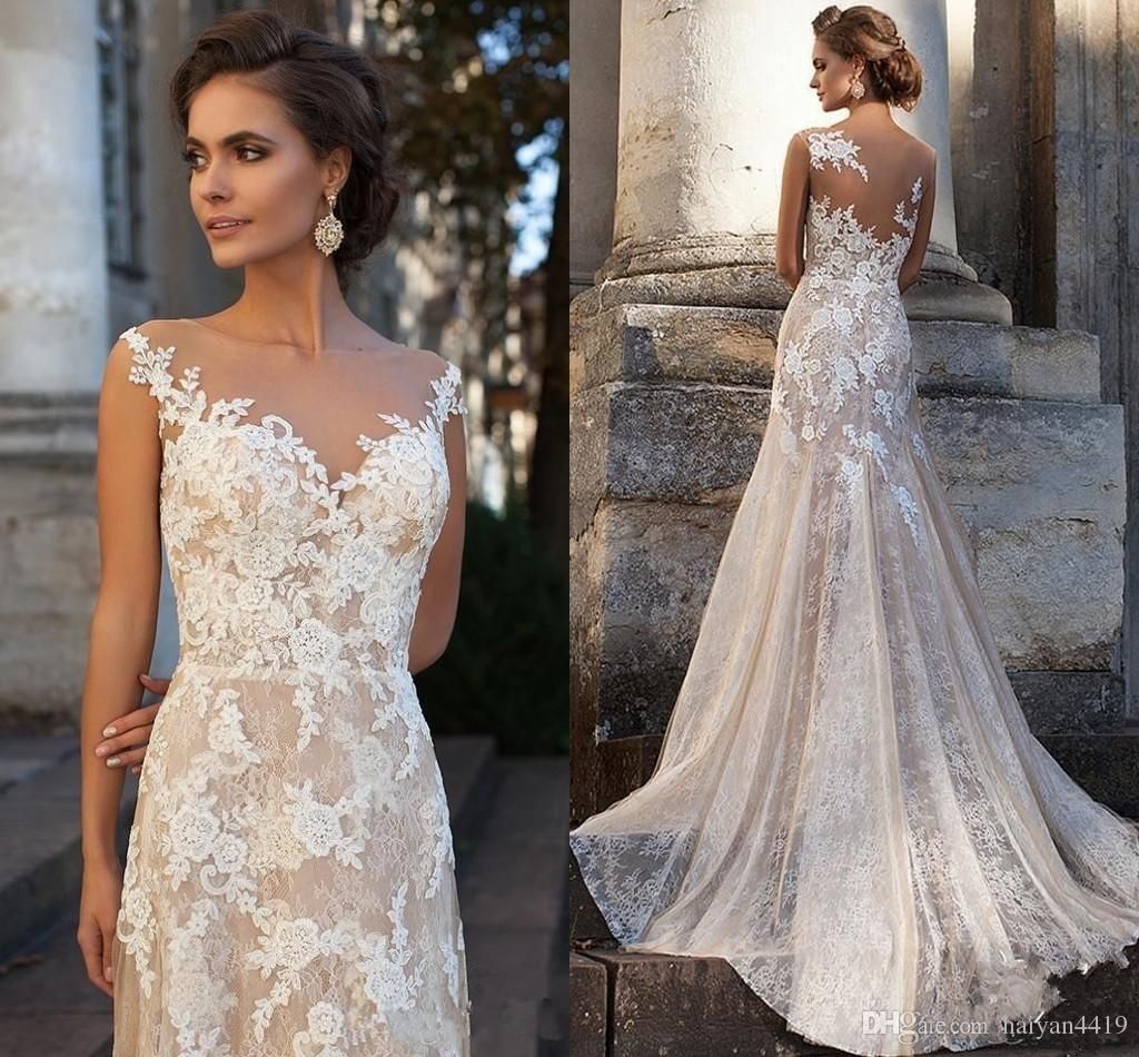 Muse By Berta 2019 Wedding Dresses Sheer Neck Lace Appliqued Bridal Gown A Line Beach Boho Simple See Through Wedding Dress With Bow