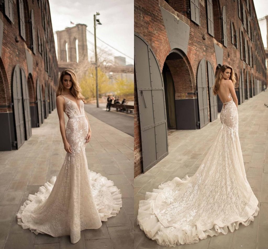 2018 Berta Mermaid Wedding Dresses Sexy Plunging V Neck Backless Wedding Gowns Custom Made Applique Lace Bridal Dress