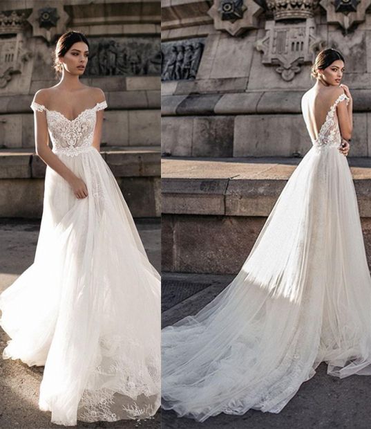 Off Shoulder Wedding Dress Sheer Bohemian Wedding Dresses Lace Illusion Bodice Tulle Sweep Train Backless Bridal Gowns Robe De Mariee
