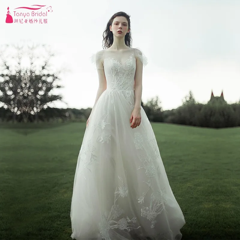 Simple Romantic Wedding Dress Polka Dot Tulle Dress Short Sleeve Wedding Gown A Line Long Delicate Dress Prom Ivory Gown Rustic Wedding