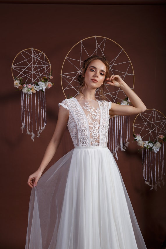 Wedding Dress Short Sleeve Wedding Dress Boho Wedding Dress Lace Wedding Dress Bohemian Wedding Dress Romantic Wedding Dress Rustic