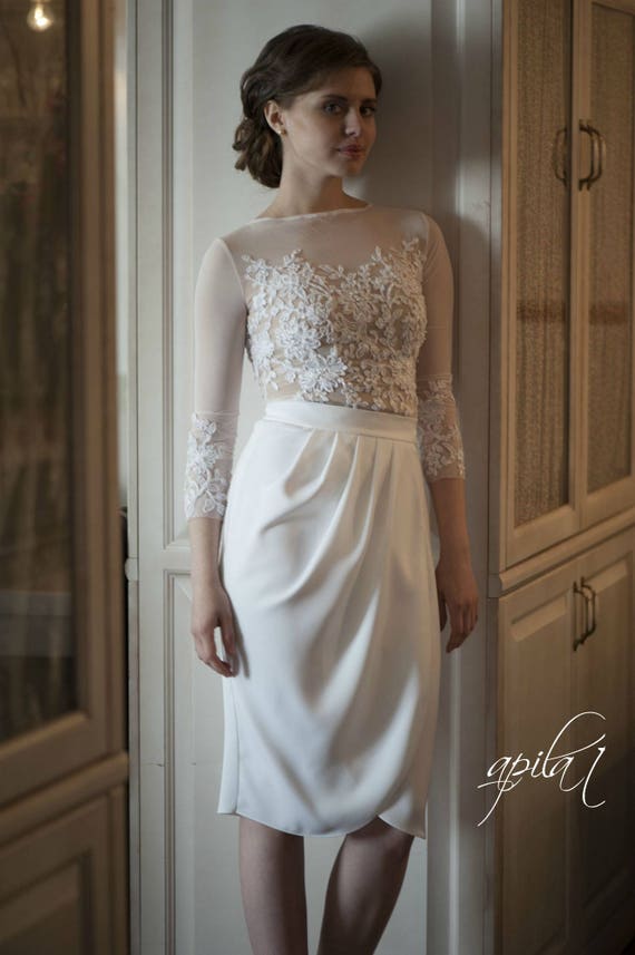 Short Wedding Dress White And Nude Bridal Gown Crepe And Lace Dress L10 Romantic Wedding Gown Classic Bridal Dress Custom Dress