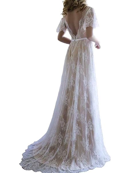 Uzn Women S Romantic Boho Champagne Lace Beach Wedding Dresses Country Bridal Gown