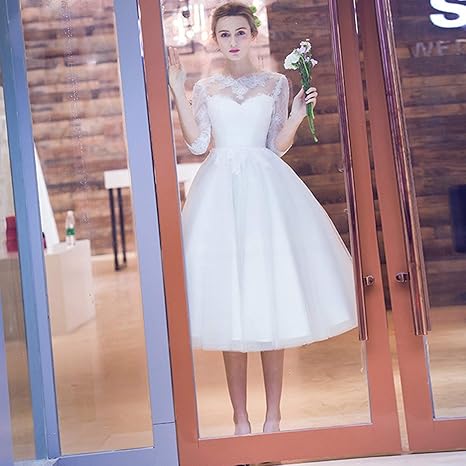 Modest Short Tea Length Lace Wedding Dress With Tulle Bottom Romantic 50s Wedding Dress Do002