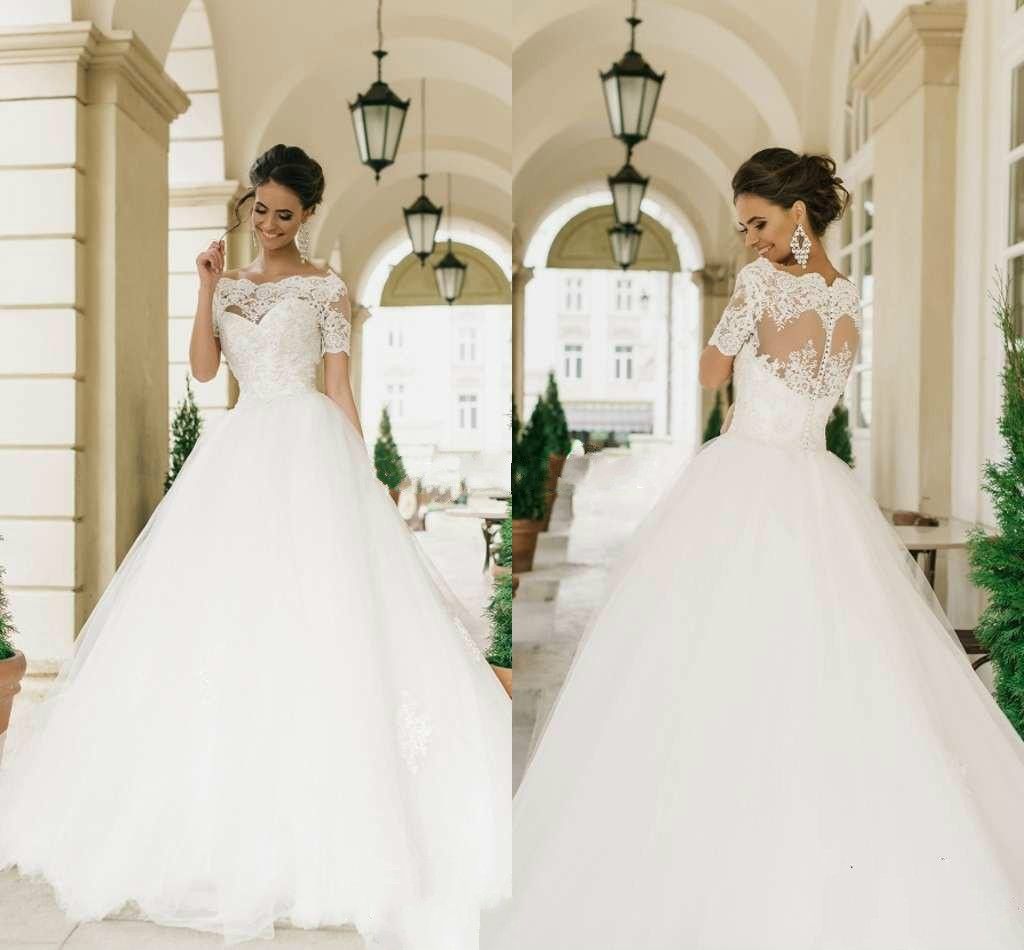 Romantic Lace Wedding Dresses Short Sleeve 2018 Sheer Illusion Arabic Milla Nova Appliques Vestios De Novia Ball Bridal Gowns Tulle