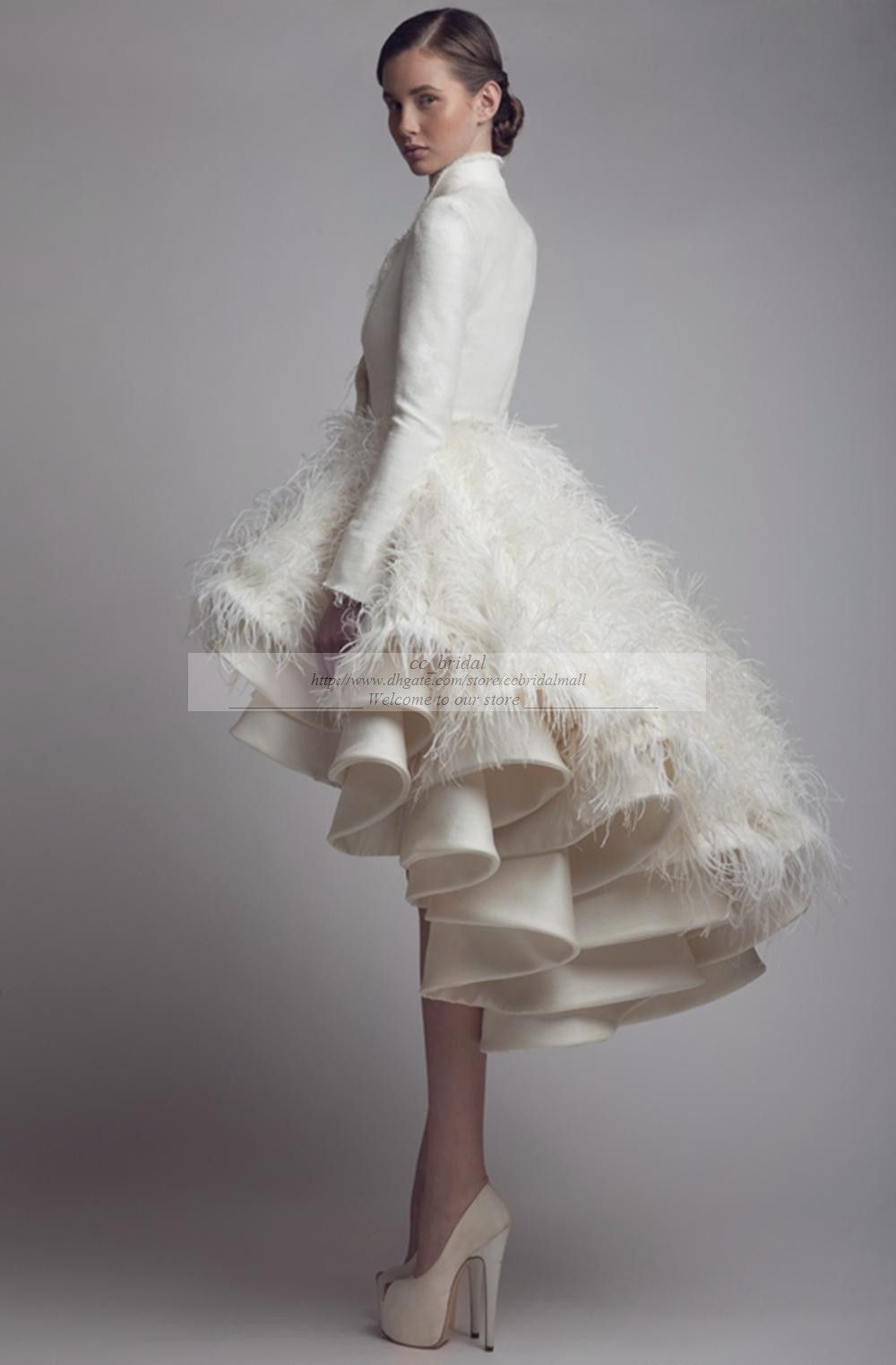 Discount Designer Krikor Jabotian High Low Wedding Dresses High Collar Ruffle Feather A Line Satin Long Sleeve Bridal Gowns Plus Size Wedding Gowns