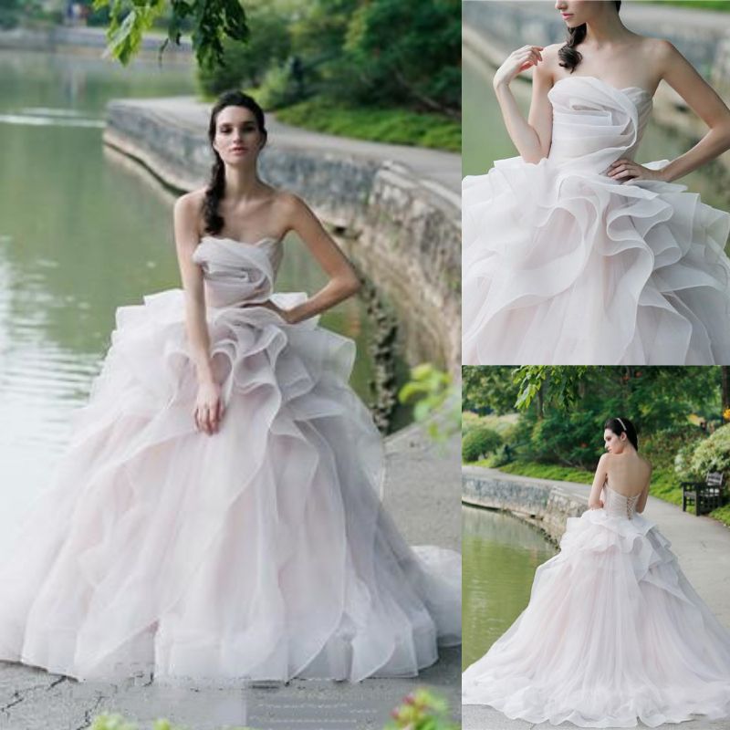 Strapless Blush Ball Gown Wedding Dress With Ruffles Organza Skirt