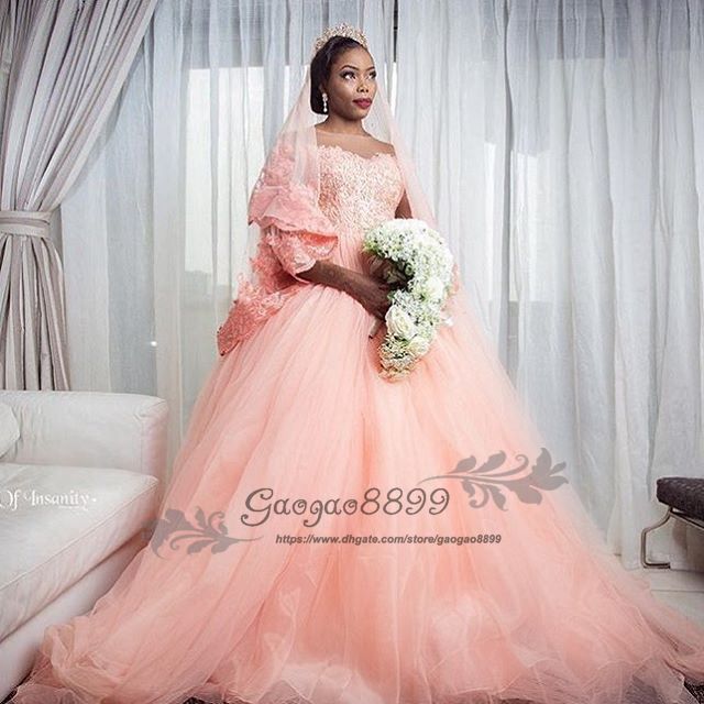 2019 Vintage Lace 3 4 Long Sleeves Ball Gown Blush Pink Wedding Dresses Sheer Neck Illusion Soft Tulle Church Formal Bridal Wedding Gowns Gown Wedding