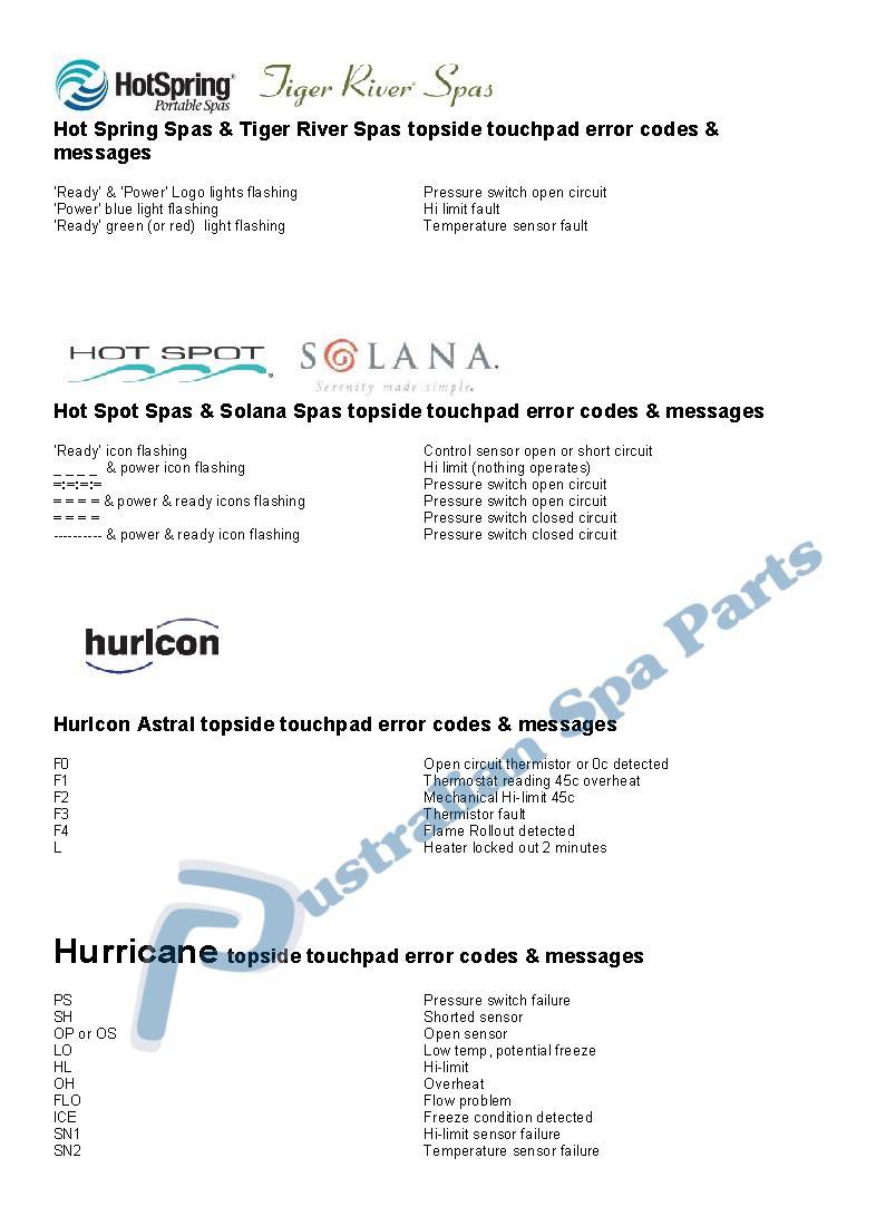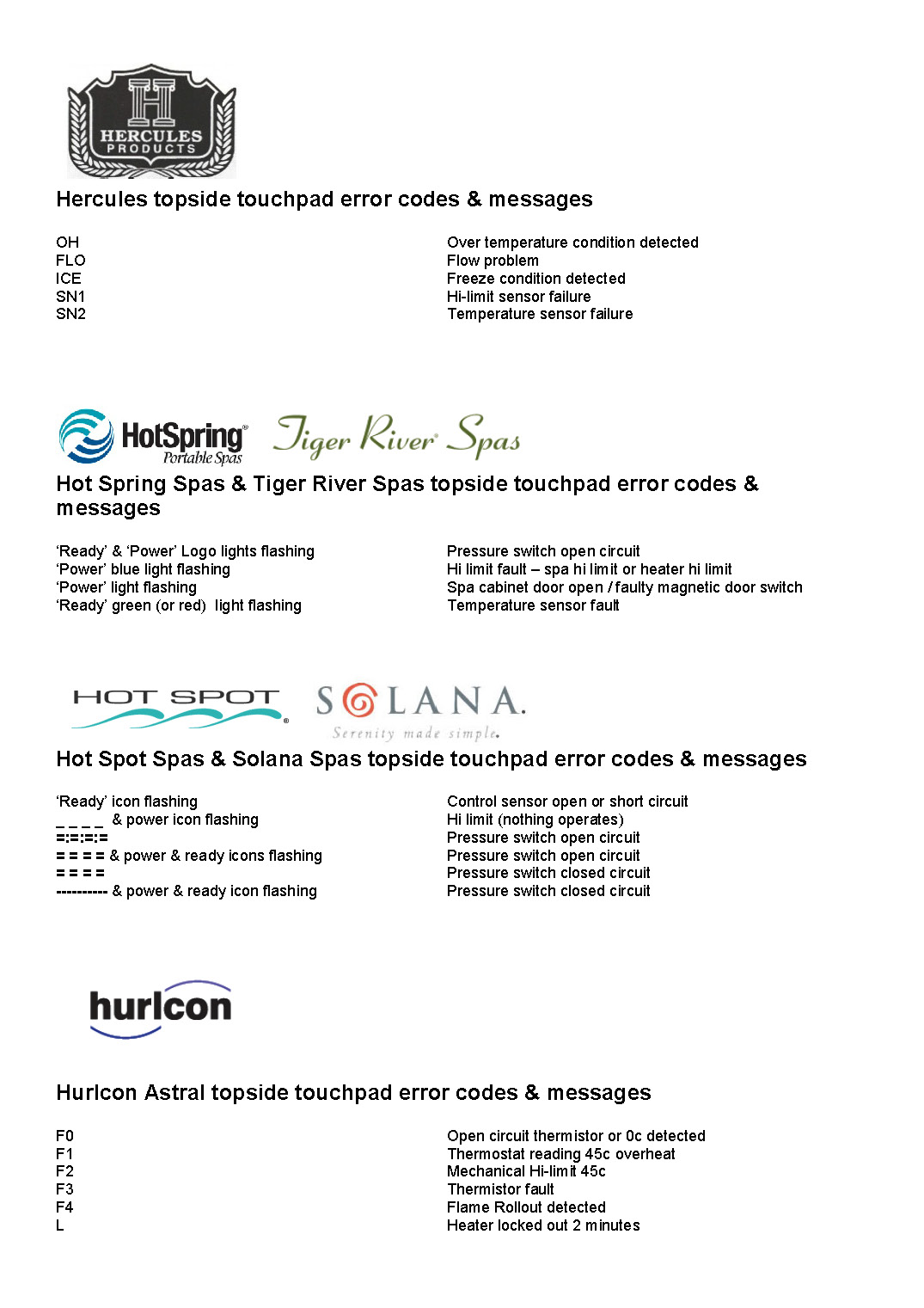 Spa Error Codes Hot Tub Topside Touchpad Control Panel Spa